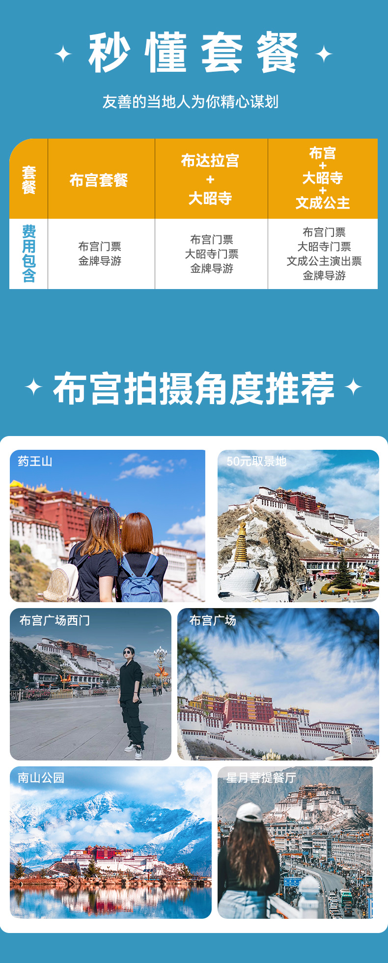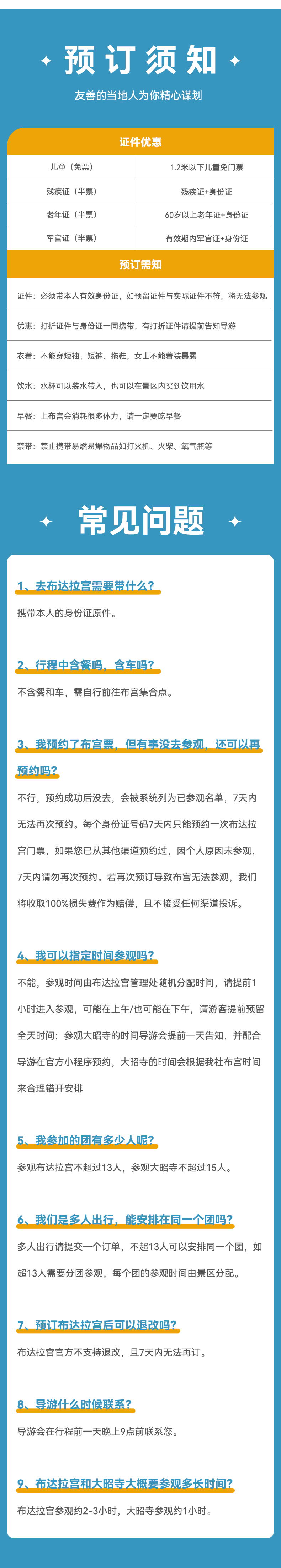 2.因布达拉宫参观时间由布达拉宫管理处随机分配,有可能是上午也可能是下午,故当天离开或到达的游客不适合预订