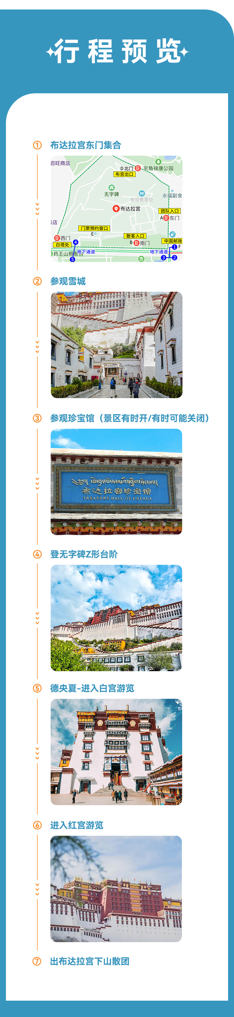 5、布达拉宫、大昭寺如遇临时闭馆不能参观,我们会提前一天通知已经预定的客人取消行程,并全款退款或改期,由此不可抗力因素导致的原因不作任何赔偿。