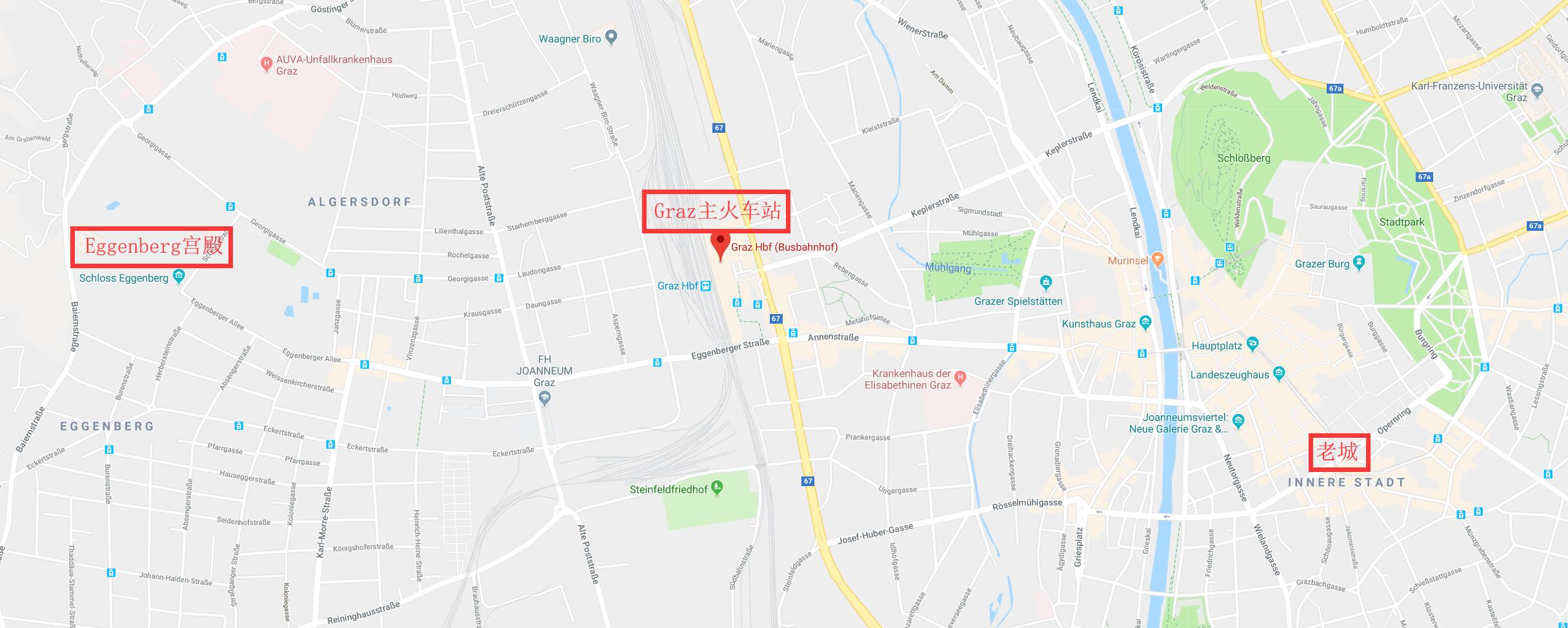 Graz比较小,所以有多趟公交车可到。从市区步行也可到达,如下面地图所示。