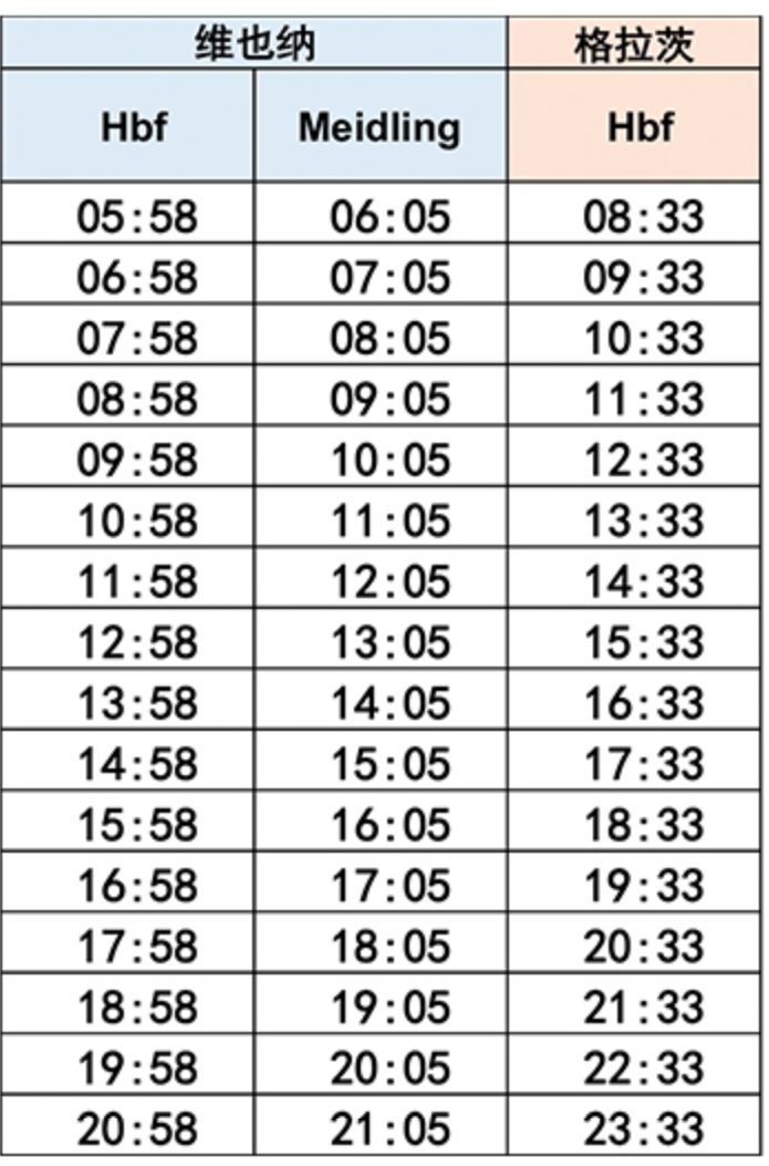 维也纳出发可以乘坐U1到达主火车站(Hauptbahnhof,即Vienna central station),或者U6到达Meidling上火车。