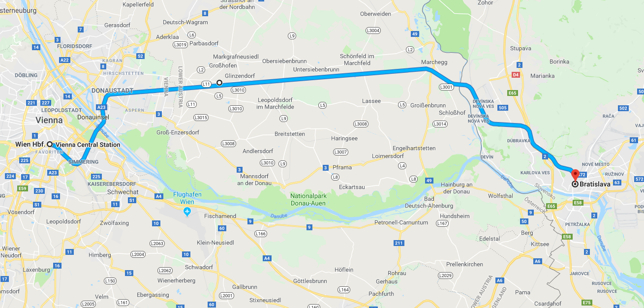 【维也纳往返布拉迪斯拉发全程运行路线】如下图: