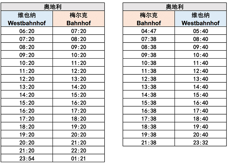【维也纳—梅尔克往返时刻表】如下: