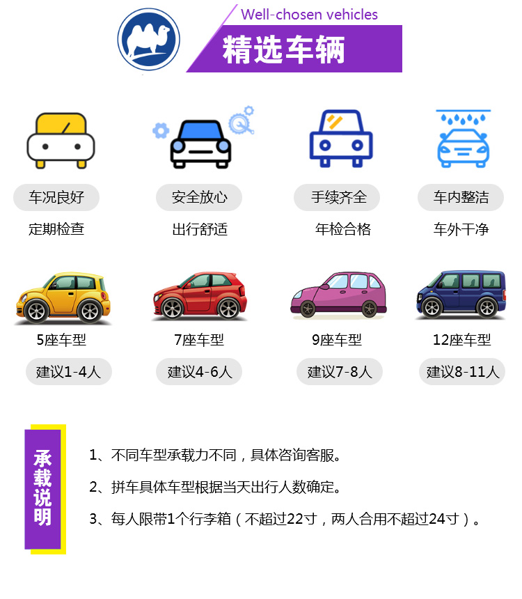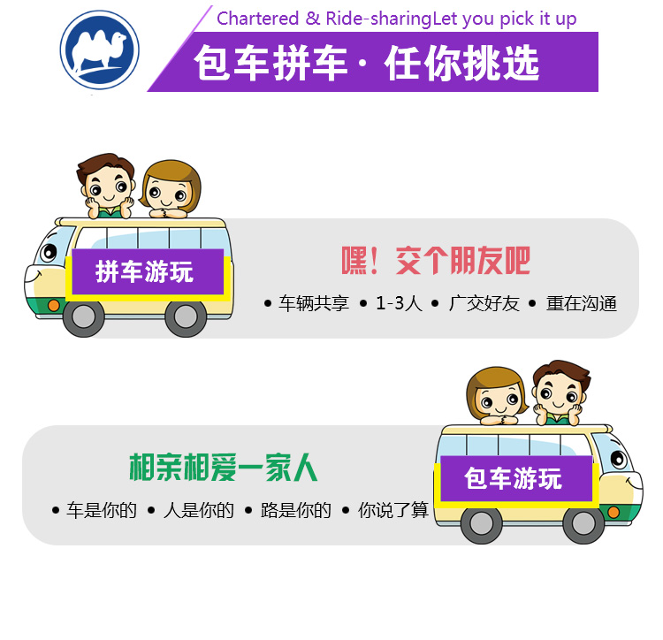 包拼车关于行:包拼车的行是最有优势的,边走边玩和自驾一样,但又省去了自驾的疲劳。只要不是很苛刻的要求,司机师傅一般都会满足,但需要注意的是西北地域广、车程一般都会较远,所以为了看到最主要的风景有时会赶路,不要太贪图路上的美景哦,要不深夜赶不到目的地入住就麻烦了。切记按行程路线走,切记多听取司机师傅的建议。