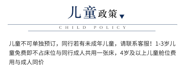 1-3岁儿童免费即不占床位与同行成人共用一张床,4岁及以上儿童舱位费用与成人同价
