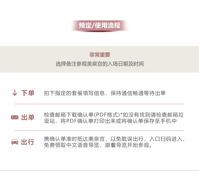 *美泉宫时间场次:08:30-16:30,入场时间为每15分钟一场,请于下单时填写时间场次。(如您所选择的场次没有余票,我们会尽快联系您调整时间)