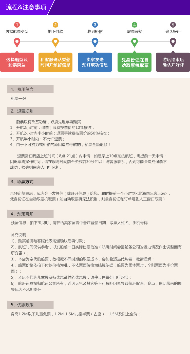 4、由于不可抗力或船舶的原因造成停航的,全额退款!