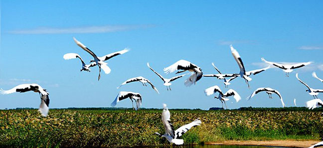 扎龙国家级自然保护区·扎龙自然保护区是世界最大的芦苇湿地,也是丹顶鹤的故乡。景区内湖泽密布,苇草丛生,是水禽等鸟类栖息繁衍的天然乐园。 ·6-9月是观鹤的最佳时节,此时的丹顶鹤比较多。鹤群放飞表演是扎龙景区的特色看点,每次大约放飞20-30只丹顶鹤。
