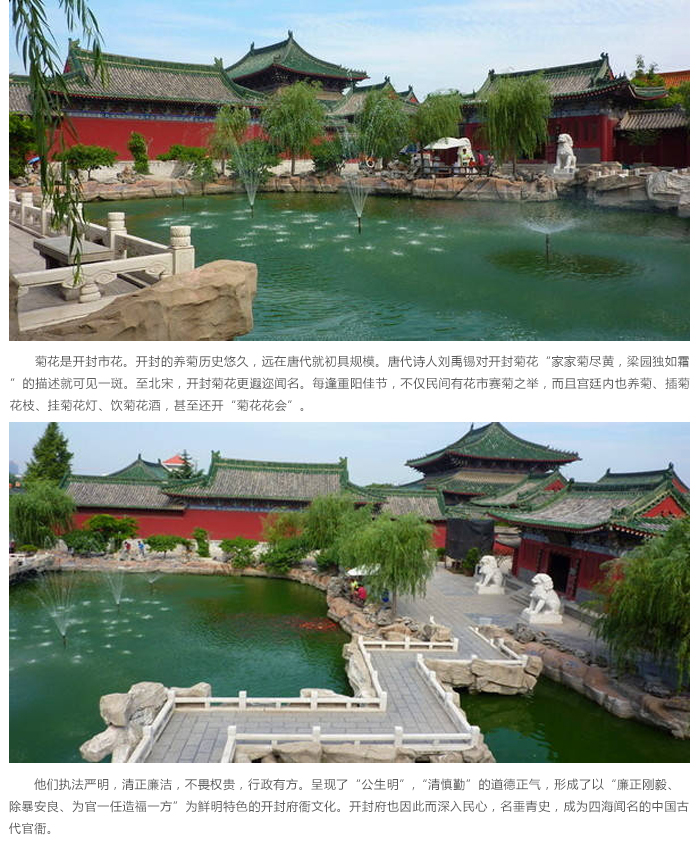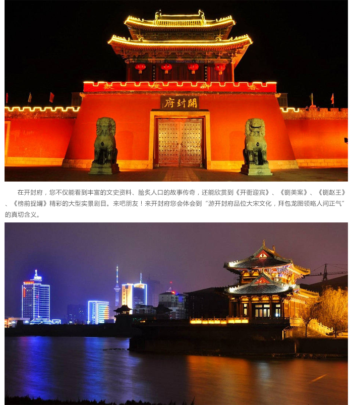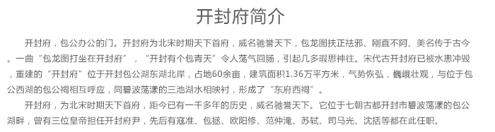 开封府·开封府又称南衙,是北宋京都官吏行政、司法的衙署,被誉为天下首府。 ·历代的官府中,规模最为宏大,相当于今天的北京市政府。 ·建筑气势恢弘,与三池湖水相衬,形成“东府西祠,楼阁碧水”的景观。 ·除大批珍贵史料和陈展外,还可欣赏“开衙仪式”、“包公断案”、...