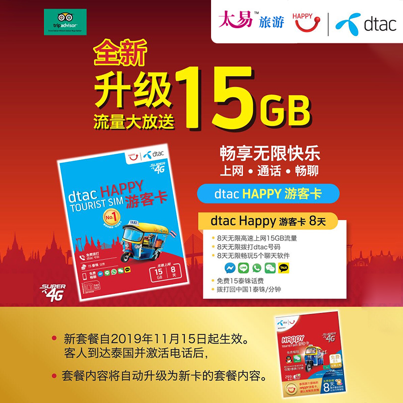 2. 2019年11月15日起,所有Dtac Happy 299泰铢8天电话卡(只要未插卡激活),套餐升级为8天15GB高速4G流量转无限低速,卡内含15泰铢话费可用于通话本地,中国15分钟,Happy互打免费,微信等5款社交软件免费。