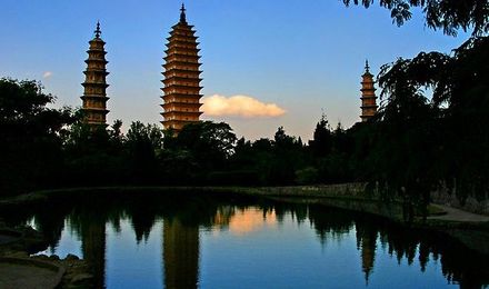 三塔倒影公园·三塔倒影公园位于三塔寺公园南侧,背靠三塔,因园内的潭水能倒影三塔雄姿而得名。 ·公园始建于80年代,园内池水碧绿如玉,清澈见底,随着观赏的角度不同,倒影形态也随之各异。 ·每当冬季,整座苍山银装素裹,三塔倒影更加迷人。 - 更多内容