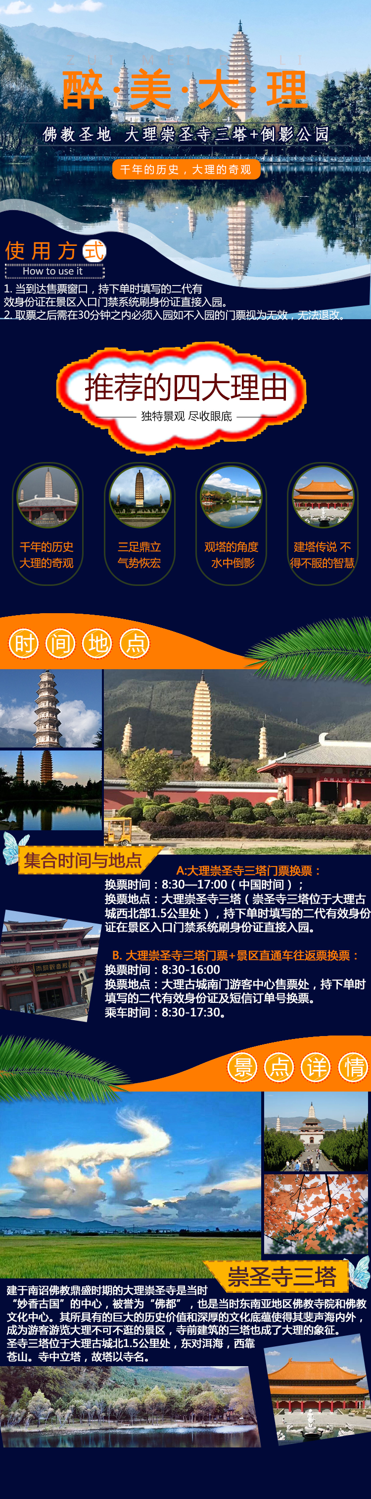 换票地点:大理崇圣寺三塔(崇圣寺三塔位于大理古城西北部1.5公里处),持下单时填写的二代有效身份证在景区入口门禁系统刷身份证直接入园。B. 大理崇圣寺三塔门票+景区直通车往返票换票: