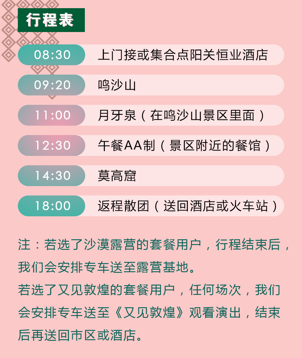2. 行程结束当日可以送您到敦煌的酒店,敦煌火车站或者敦煌机场。