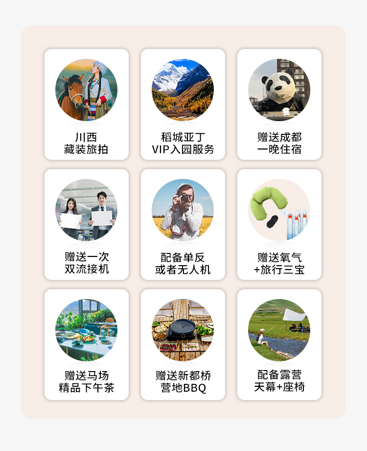③【嗨皮旅拍】随车司机单反或无人机随机配备,创意旅拍底片全送,川西定点藏装旅拍+送精修图(川西定点藏装旅拍为,塔公草原、稻城马场二选一,若不去马场则无旅拍,以行程情况随机选择旅拍点; 无人机/单反数量有限,旺季、特殊节假日不做指定安排,谢谢您的谅解与支持)。