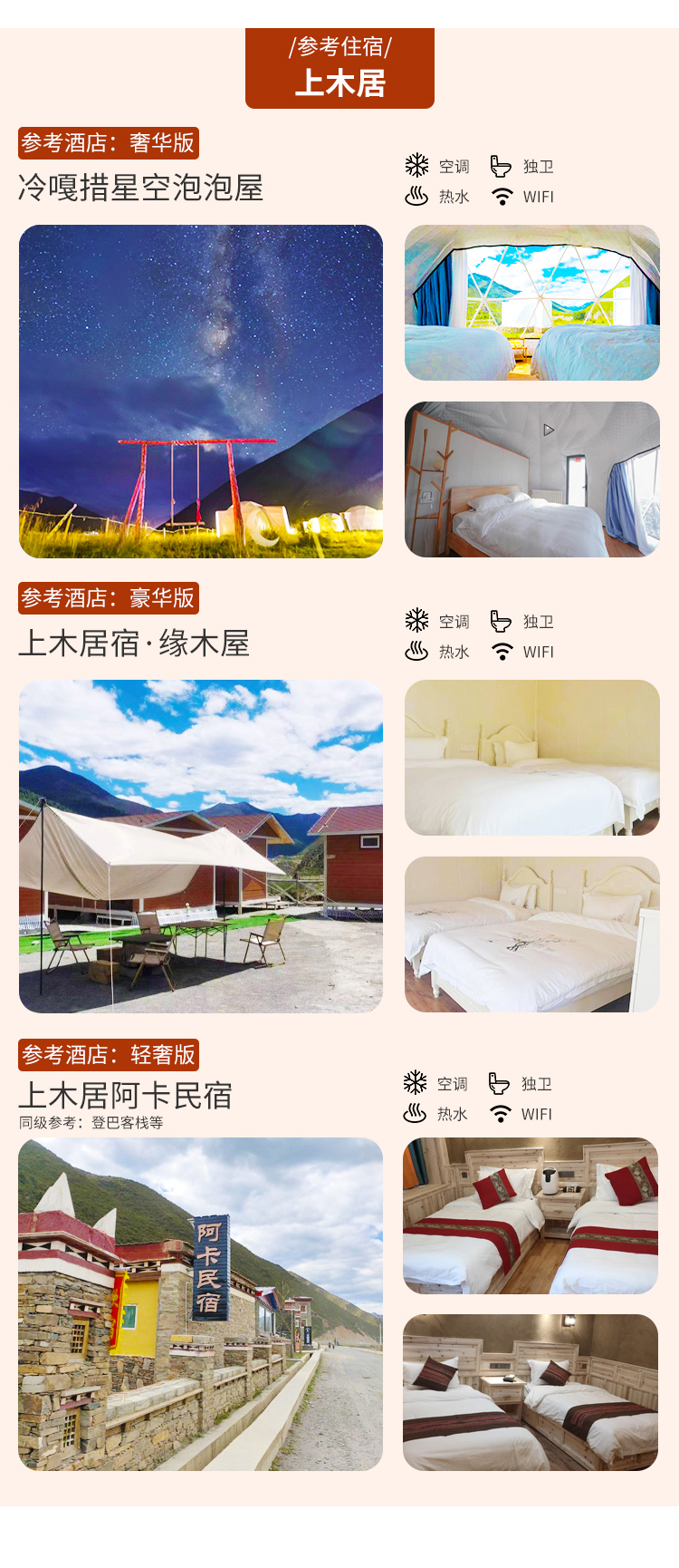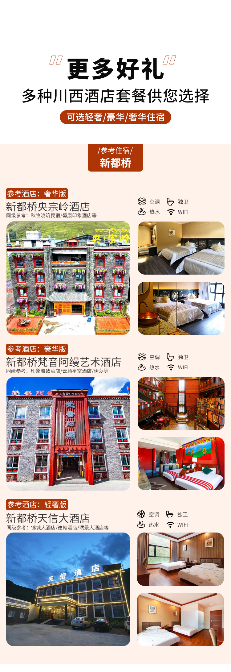 b、住宿套餐不指定酒店名,根据当天住宿紧张度,实时房价,道路状况,游玩时长等实际情况安排;川西高原的酒店,大部分没有空调,但是能保证有电热毯。