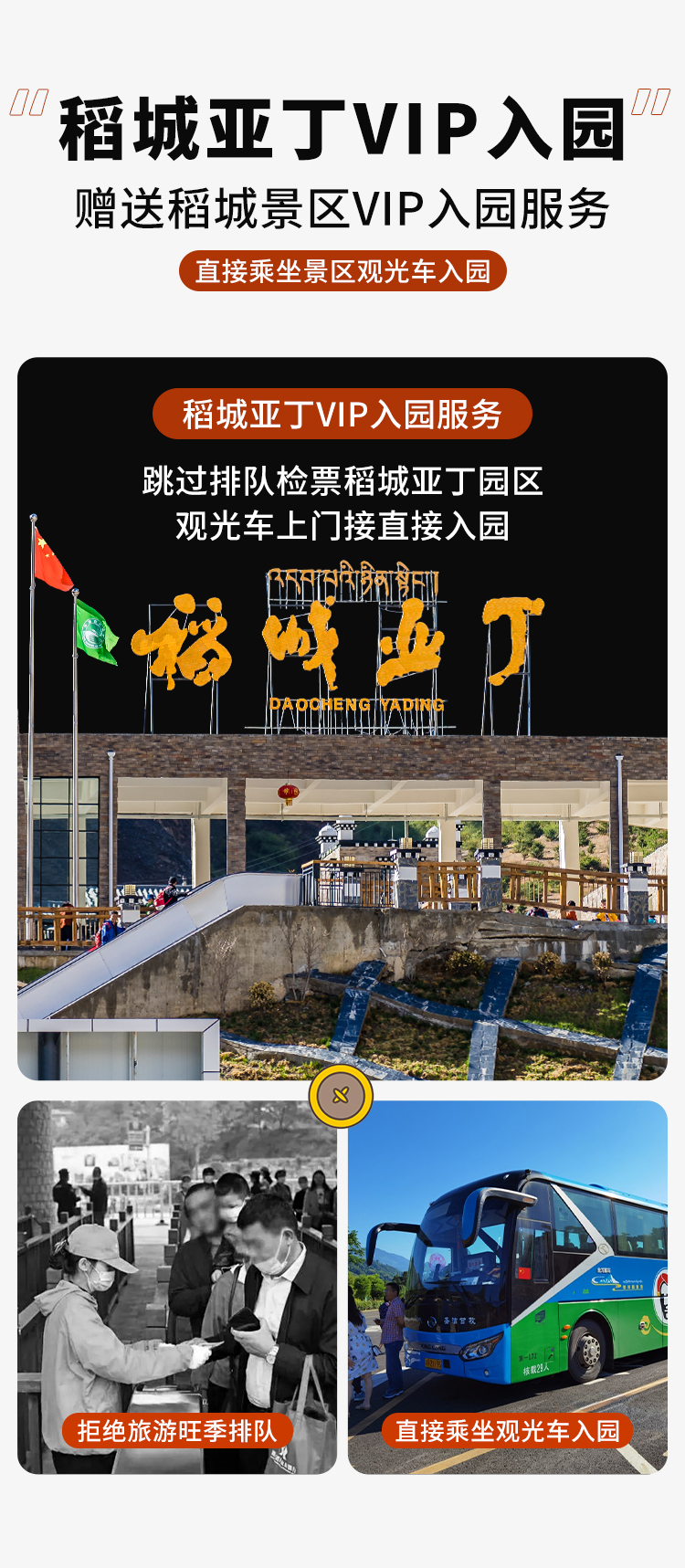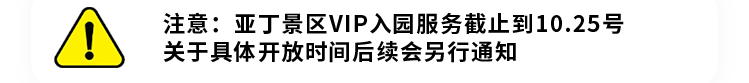 注:我社赠送的亚丁VIP入园服务2023年截止到10月25日,之后景区将进入错峰游玩季,游客中心可直接乘坐景区观光车入园即可顺畅游玩,祝您游玩愉快