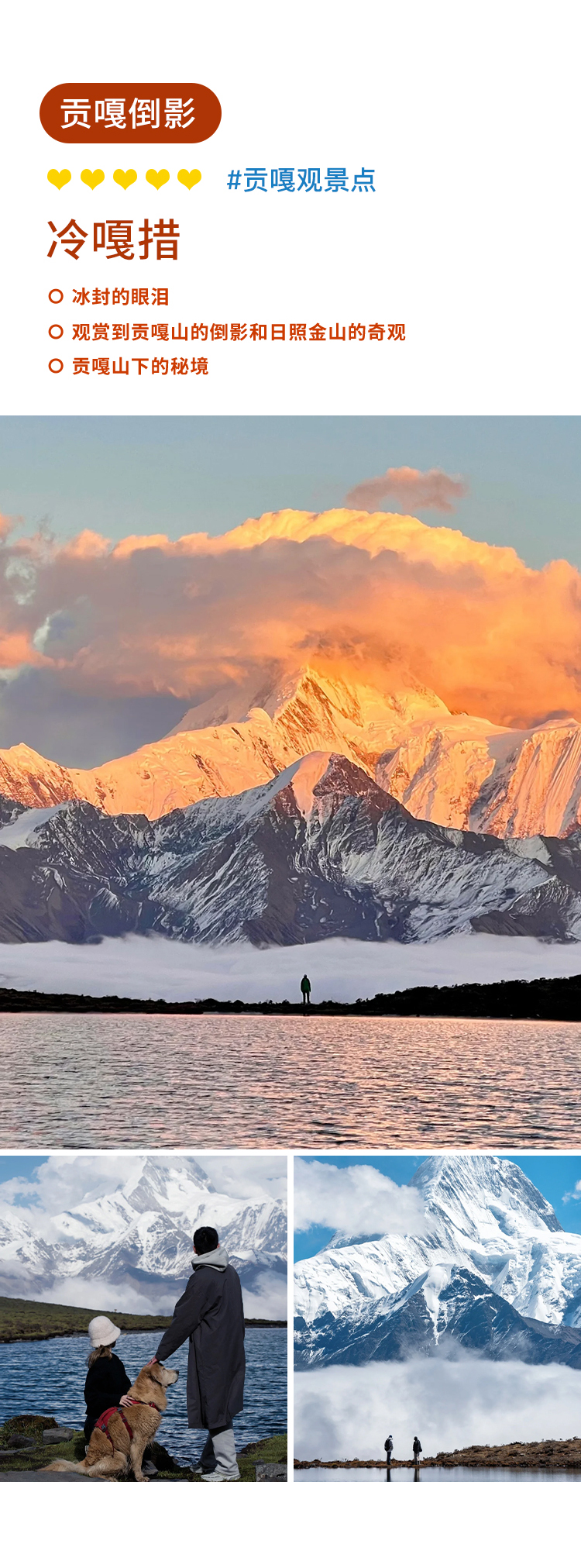 d. 可能会产生的费用:泸定桥10元/人(如上桥需自费购买门票)、塔公寺20元/人(进寺参观需购买),海螺沟索道150元/人等;