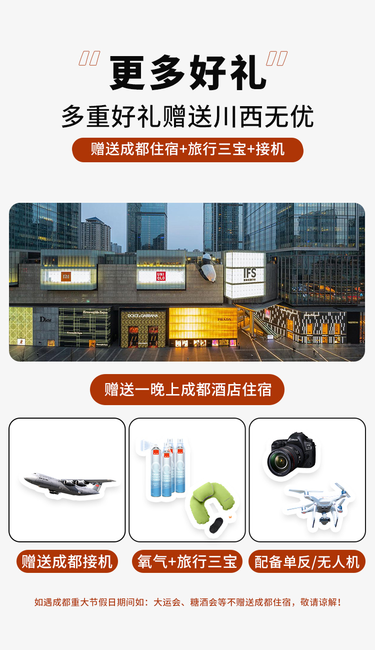 ⑥【赠送住宿】2人起订即赠送出行前一晚成都酒店(纯净版无成都住宿,无VIP入园套餐;注:成都特殊重大节日如大运会、糖酒会或特殊节假日如国庆,春节等均不赠送可优惠80-100每人,具体金额请于客服核实以下单档位为准,优惠金额仅限下单此产品使用)