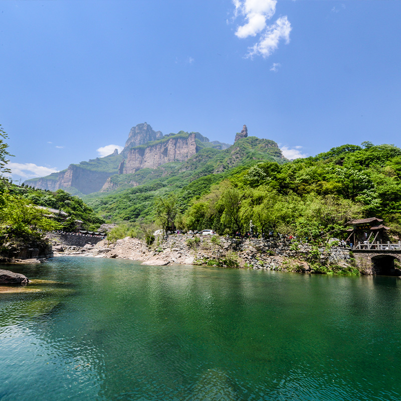 山可以看到太行绝壁,挺拔险峻,直插云霄,蔚为壮 观。此地有一天然大圆石,可以膜拜。北面大皇龛上方有一幽深山谷,阴柔 秀美,又名“女娲谷”。