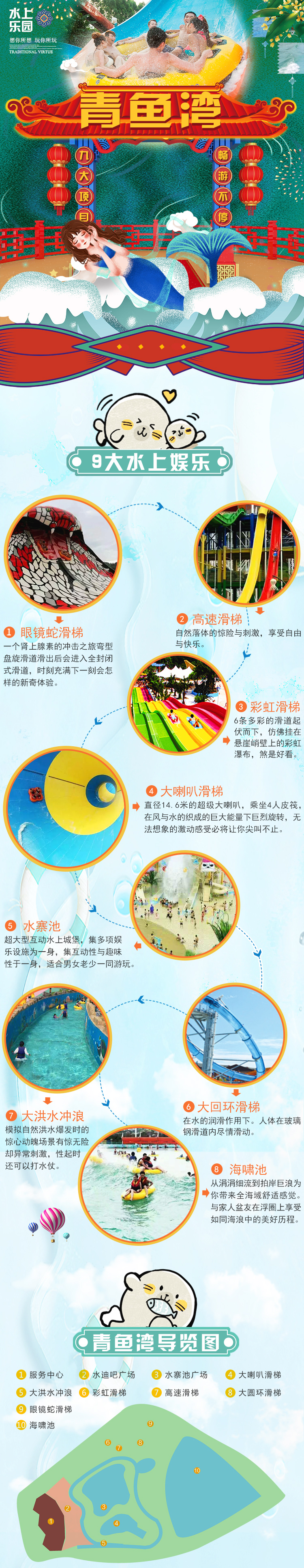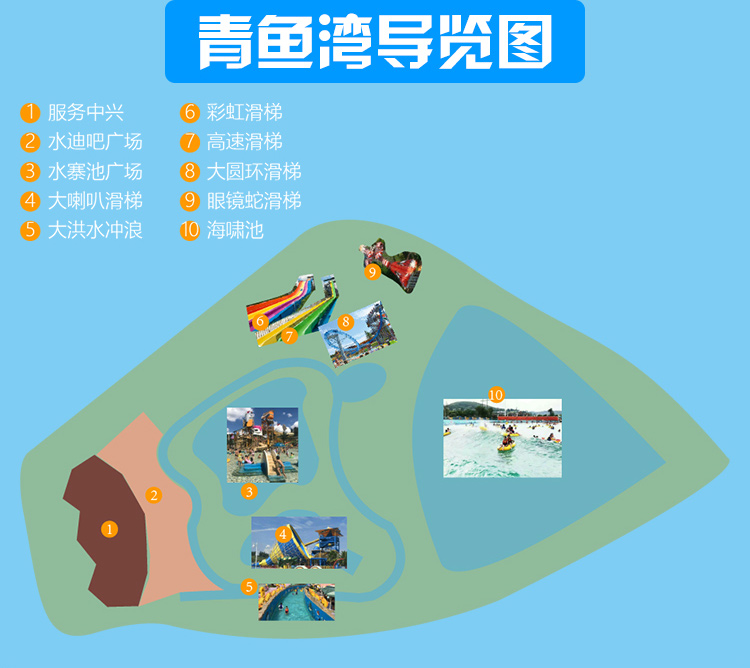 1.青鱼湾水乐园票1张、(眼镜蛇滑梯、高速滑梯、水寨池、大喇叭滑梯、急速漂流、大洪水冲浪、彩虹滑梯、海啸池、大回环滑梯)。
