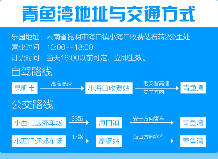 1.昆明市内在小西门可乘33路公交车至海口镇→换乘海口至安宁方向客车,在过小海口村后约2公里处下车即可青鱼湾水上乐园;