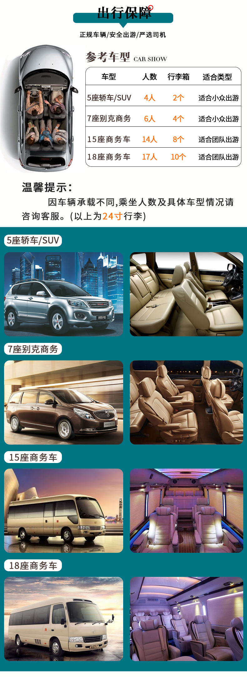 2、用车:参考行程所列的当地用车(其他人数所配车型请咨询客服);