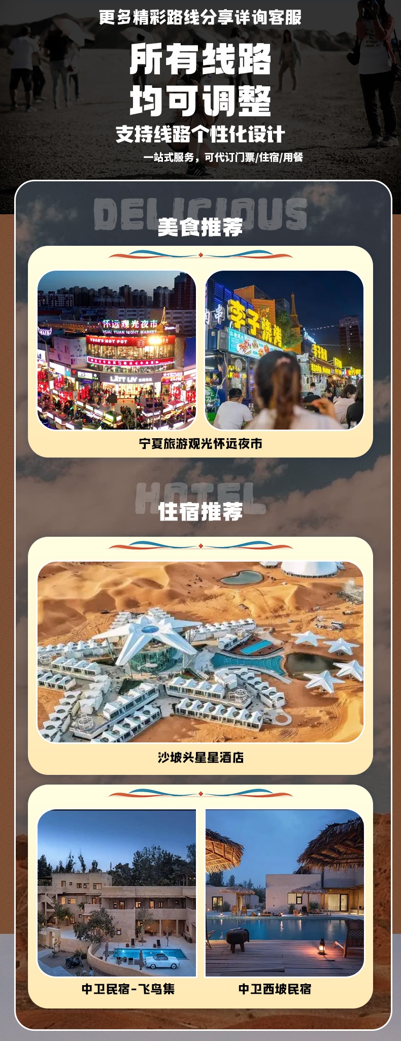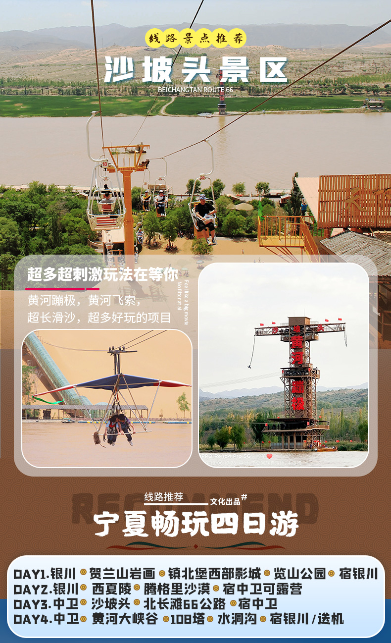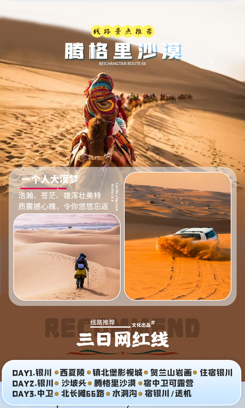 4. 中卫沙坡头景区、腾格里沙漠以及明长城、南寺、月亮湖,行程地域较远,如需走此线路请咨询客服;