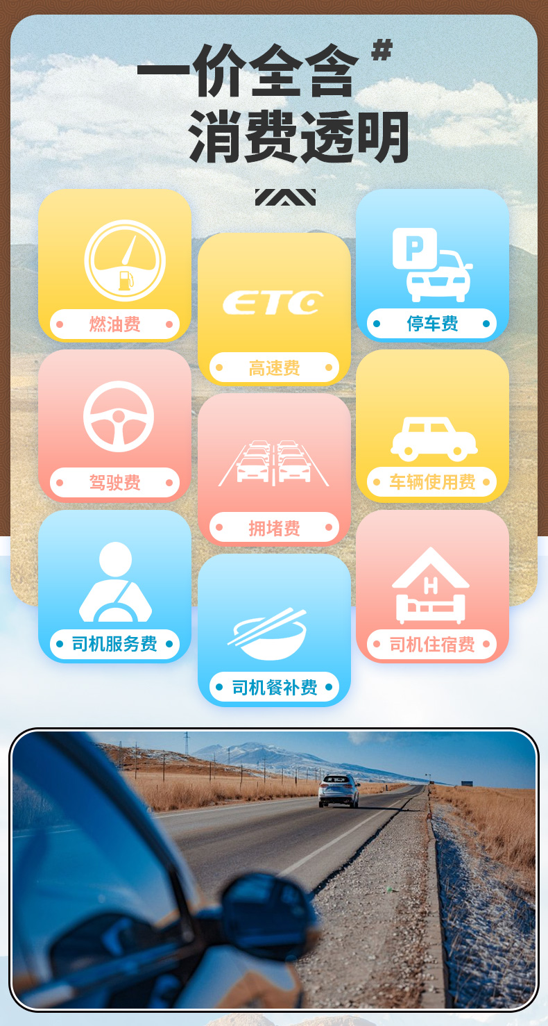 1. 车辆所需费用:车辆燃油费、停车费、高速费、车辆使用费、进城费、拥堵费;2. 司机所需费用:司机服务费、餐费;