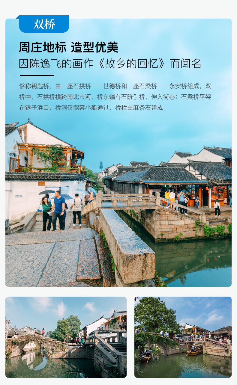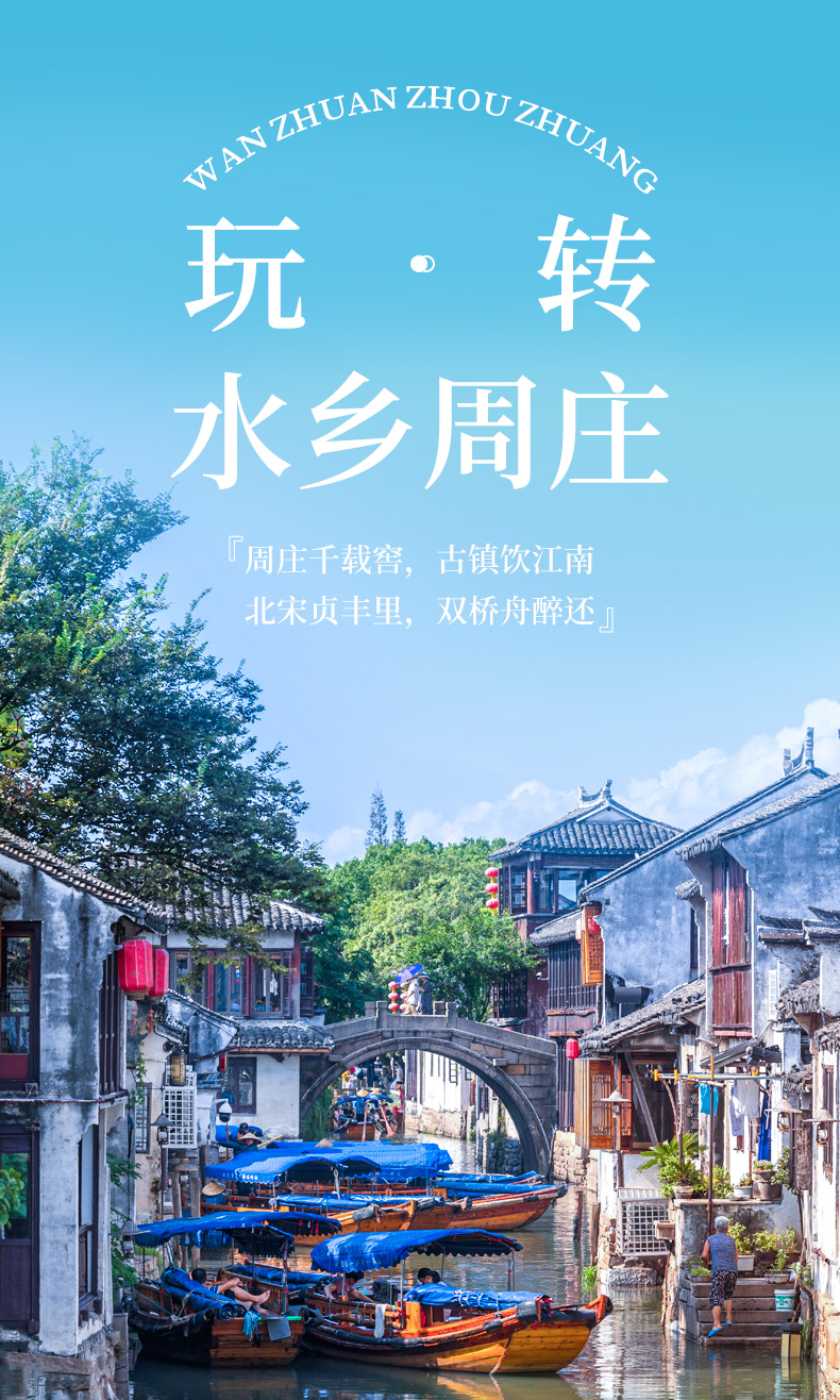 周庄古镇Zhouzhuang Town·是一座江南小镇,有“中国第一水乡”之美誉。 ·沈厅、张厅、迷楼、叶楚伧故居、澄虚道院、全福寺等名胜古迹,具有很高的历史价值和观赏性。 ·古桥居多,且桥桥相望,桥桥相连,至今仍保存着建自元、明、清代的石桥。 ·坐在船上游览,穿桥过洞,颇有情趣。