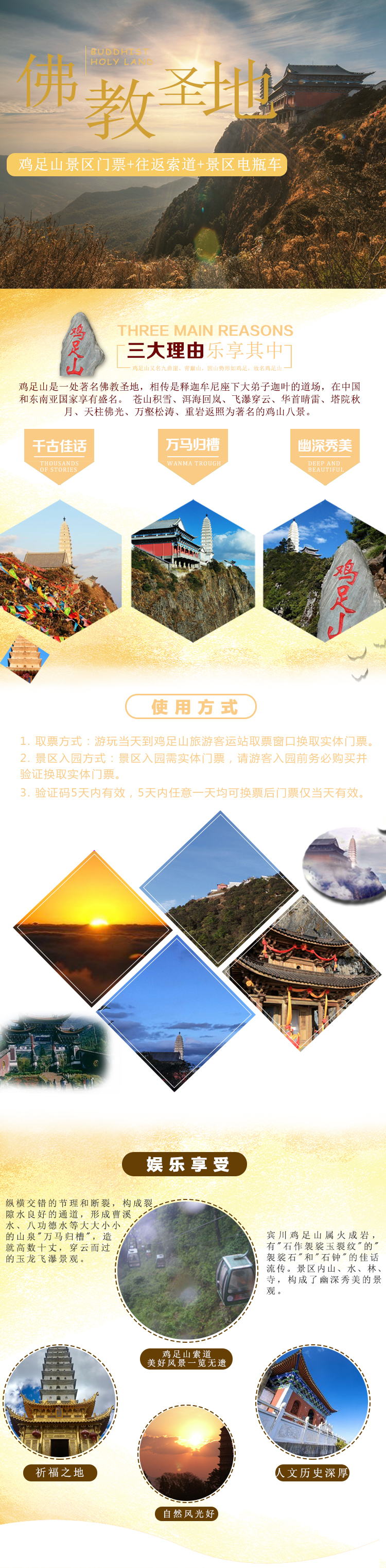1. 取票方式:游玩当天到鸡足山旅游客运站取票窗口换取实体门票。