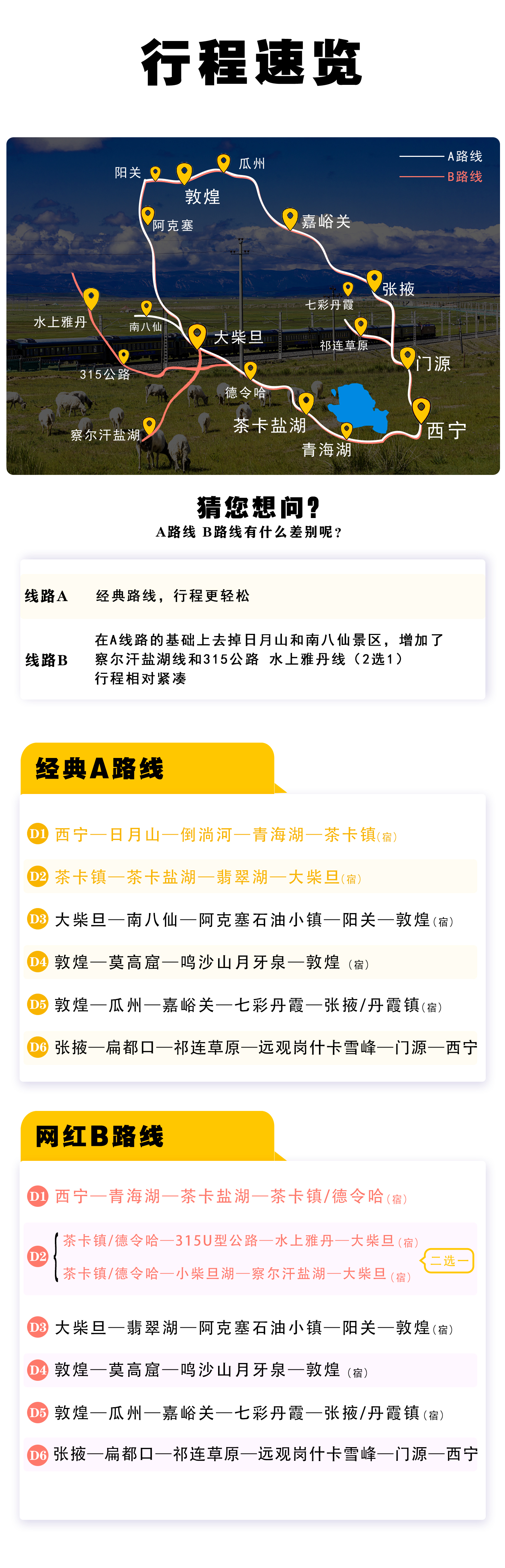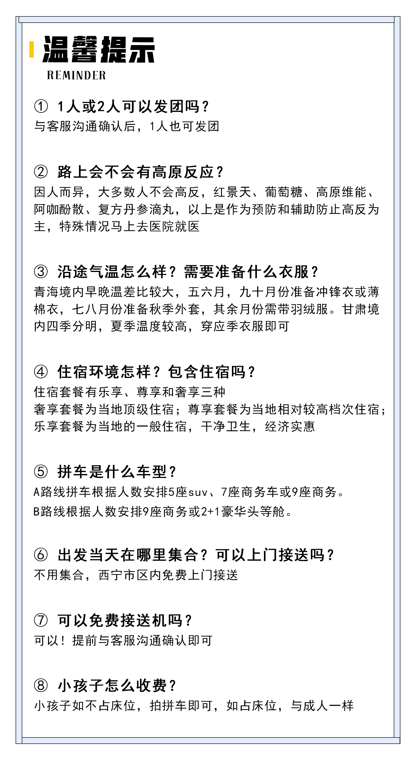 1、关于酒店接机、接站:本旅行路线出发地为青海省西宁市市区,建议您在出发一天到达西宁市,出行前一天20点至22点左右司机师傅会和您取得联系,询问您的酒店定位并约定出发时间,西宁市内酒店司机师傅会在次日免费上门接驾。乘坐火车或飞机在出发当日抵达的游客建议在早上9点前抵达西宁市区;具体情况请事先与客服沟通,以免耽误行程。