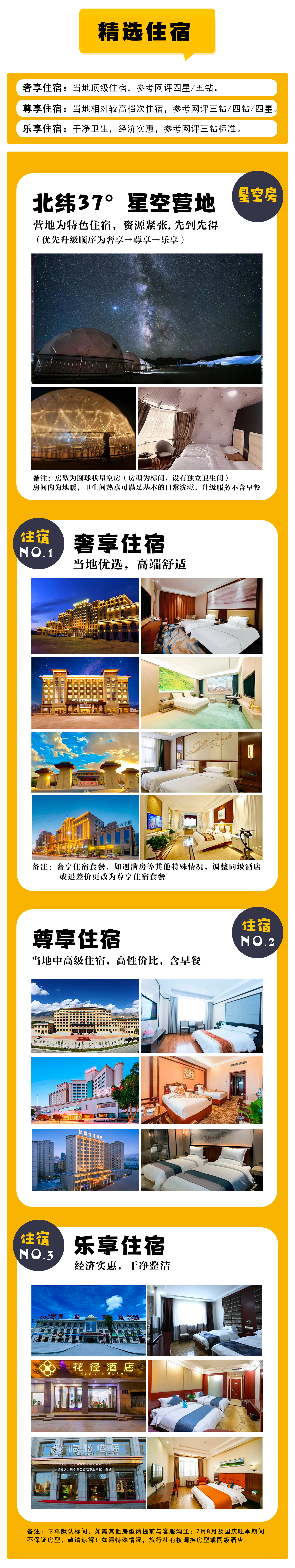 因旺季资源紧缺,酒店价格浮动较大,7/8月不再支持乐享住宿升级星空露营。尊享和奢享住宿如需升级星空露营,请与客服核实。