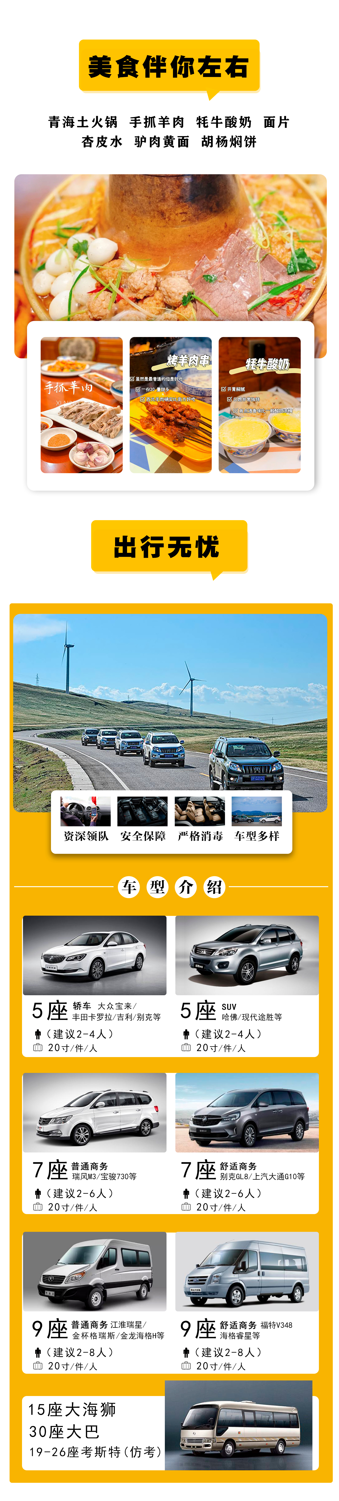 7、车型问题:详情页描述车型为参考车型,若无与客服明确或备注指定车型,旅行社可根据情况指派同等级车型。8、接送机:1、如需接/送机 请下单后务必与客服提前沟通,告知航班信息,如因自身原因未提前告知客服或航班延迟导致未能接机,旅行社不承担任何责任。2、接送机为赠送,我社接送机师傅会根据游客接、送时间协调时间,会出现需要在机场等待的情况,我们尽量不让您等待时间超过1小时,敬请谅解!3、旺季司机师傅工作量大,早上8点前,晚上12点后不再安排接送机!