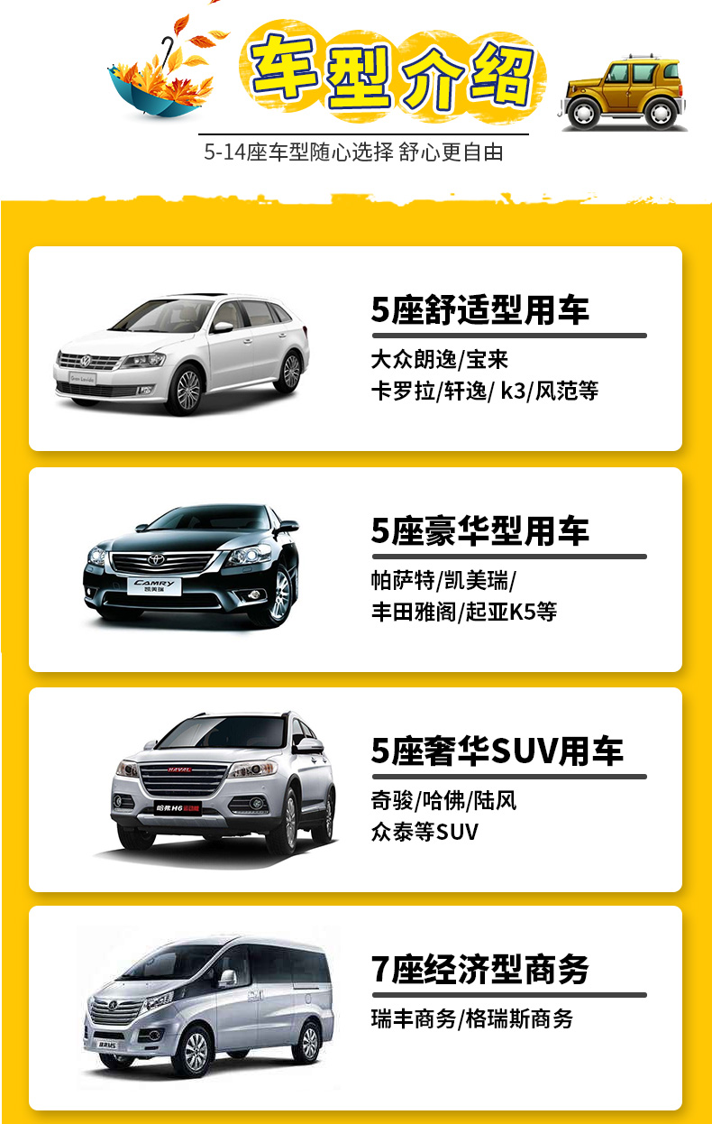 1.包车车型具体乘坐人数及行李携带大小,下单前先详询客服,若不咨询直接下单,可能导致有些人数及行李安放不下,导致退款重拍其他车型,请包车游客朋友们下单前详询客服;