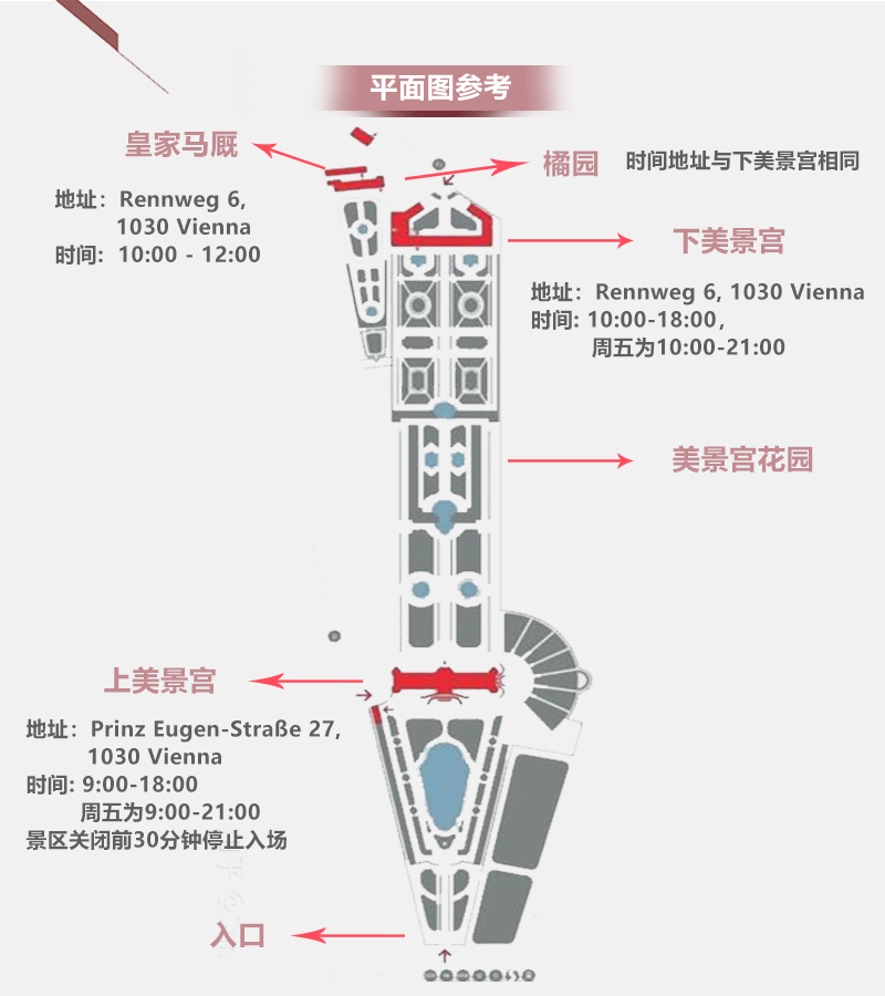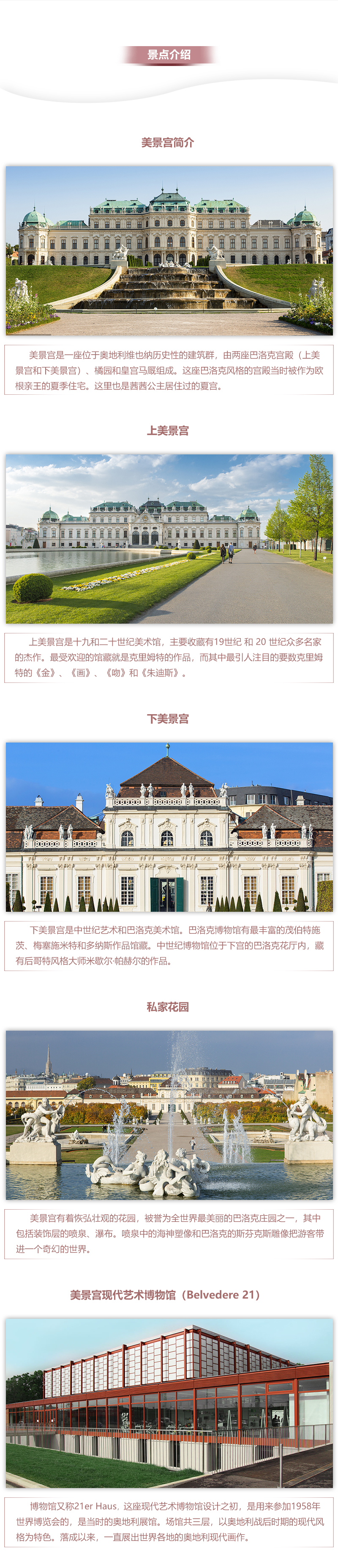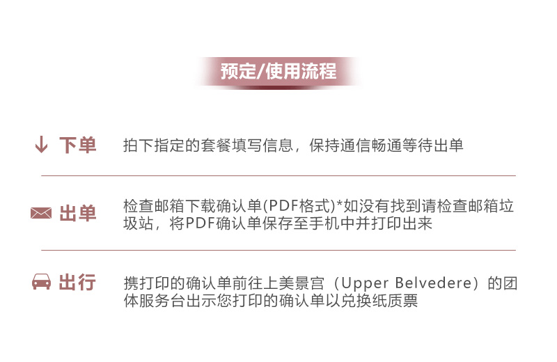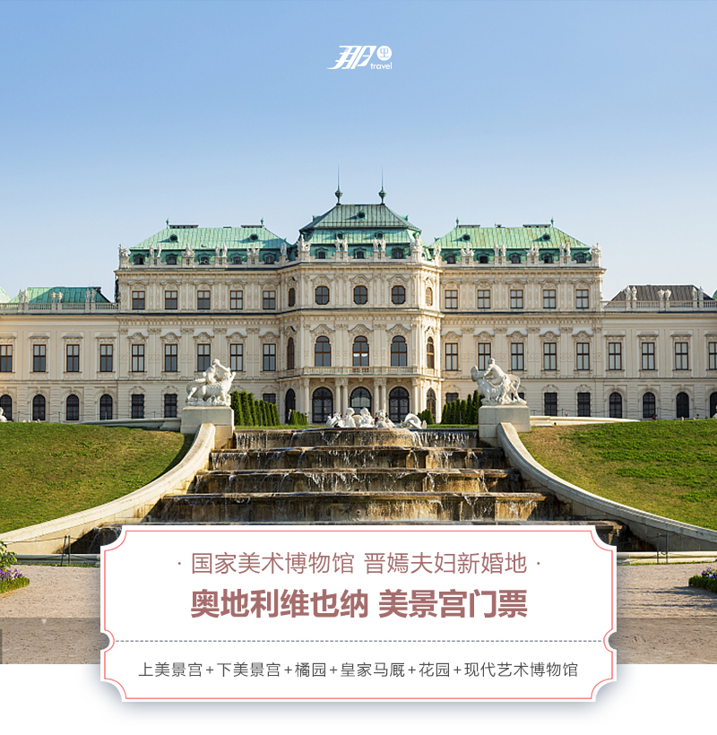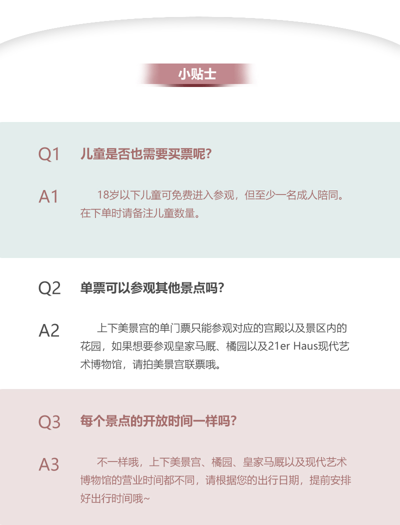 3. 上下美景宫门票:上下美景宫联票一张(准许进入上下美景宫以及橘园、皇宫马厩、室内花园和现代艺术博物馆)。