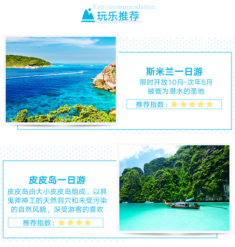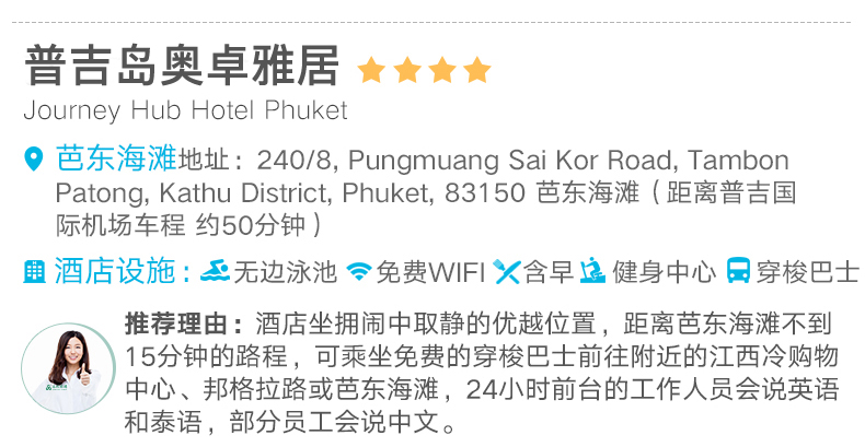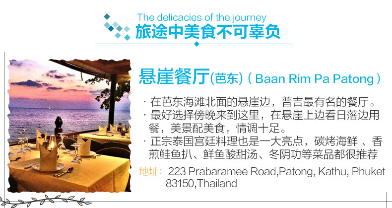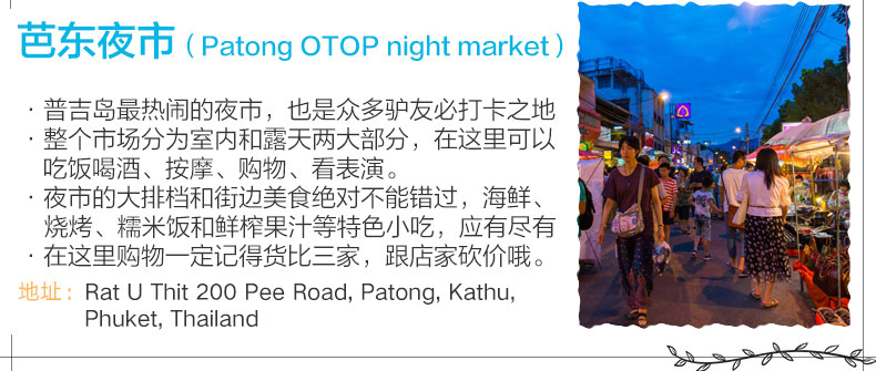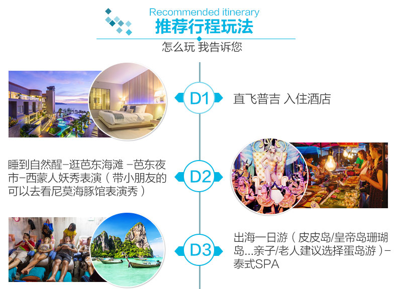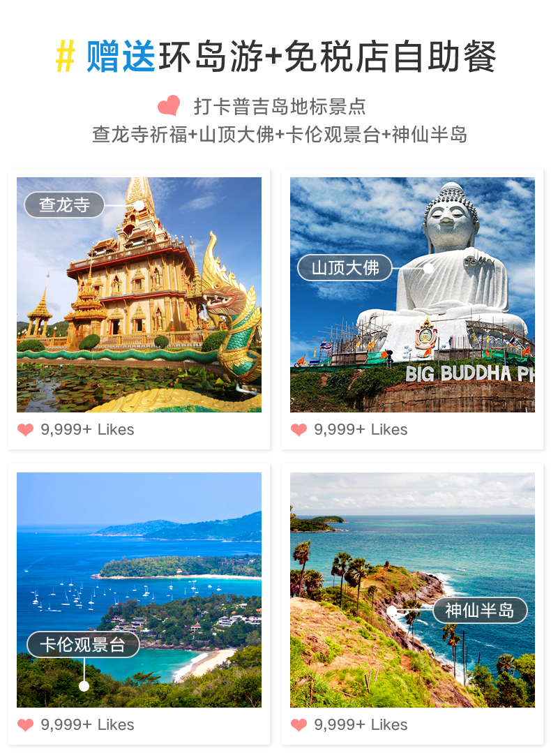 9:30-10:00司机到酒店接人(具体时间以客人通知时间为准;如遇酒店有多个大堂,请提前确认接人地点) 10:30-11:30 普吉镇老街,体验普吉风情 普吉镇老街:普吉镇是普吉岛文明起源的地方,也是政府机关的所在地。保留了百年葡萄牙风格建筑,部分老房子被改建成了酒吧和客栈,核实小清新们,很多摄影爱好者都喜欢像当地人一样游走,捕捉普吉镇旧时光的影子。 11:40-15:00 王权免税店自助餐接待登记,发放优惠券和餐券 15:10-15:50参观壮丽百年查龙寺 查龙寺是普吉岛zui大zui宏伟华丽的佛教寺院,已超过100年历史,整个寺庙结合泰国南部、中部、东北部的建筑风格。在普吉的寺庙中,此处的香火最旺。供奉着108尊金佛的佛堂给人留下的印象颇深。是该地区weiyi收藏这个圣物的地方,里面有佛祖的舍利子 16:10-16:30卡伦观景台。俯瞰感受普吉三大海滩的之美观景点 卡伦观景台:在卡伦海滩的山顶处有个观景亭,此处拥有良好的视野,天气晴好时可以将大小卡塔卡伦海湾尽收眼底 16:40-18:00神仙半岛 神仙半岛,在泰语中的意思是“上帝的岬角”由于观景台上供奉了一尊四面佛故名之。曼妙风情的海滩、壮观的岩壁景观、醉人的日落美景,夕阳洒在海面上,海风吹拂伴着淡淡的海水的味道,你会想让时间停在这一刻 18:30送回酒店或芭东夜市或普吉镇夜市 芭东夜市:大街小巷都是商铺,商家大多可以用英语沟通,傍晚是这里对热闹的时刻,琳琅满目的小吃摊位,可以品尝到当地特色小吃。各种酒吧,体验不一样的夜生活 普吉周末夜市让你能体验一回真正的泰国生活的滋味,各类商品琳琅满目,泰国特色小吃美食,市井风情浓郁,是吃货必去的打卡地。