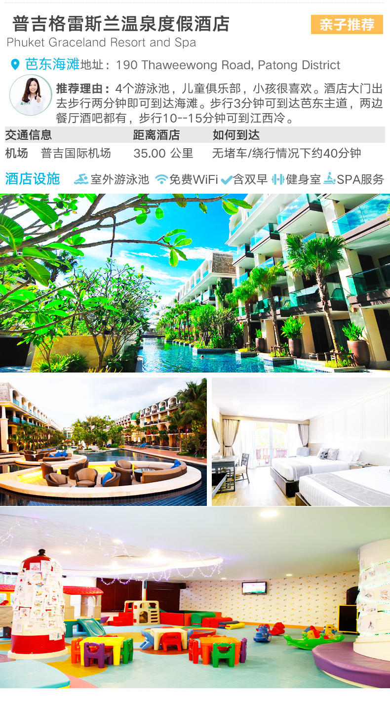 2. 酒店:所选套餐的酒店住宿,详见“酒店介绍”,其中格雷斯兰温泉度假酒店 :酒店会收取不占床的儿童的早餐费,需要客人在酒店前台自行支付,具体价格政策以酒店前台公布为准