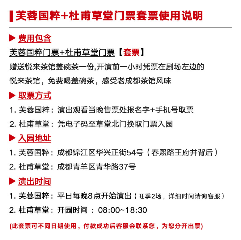 2. 芙蓉国粹赠送悦来茶馆盖碗茶一份(19:00-20:00)【19点取票后可以凭票在剧场旁边的悦来茶馆,免费喝盖碗茶,感受老成都茶馆风味】;