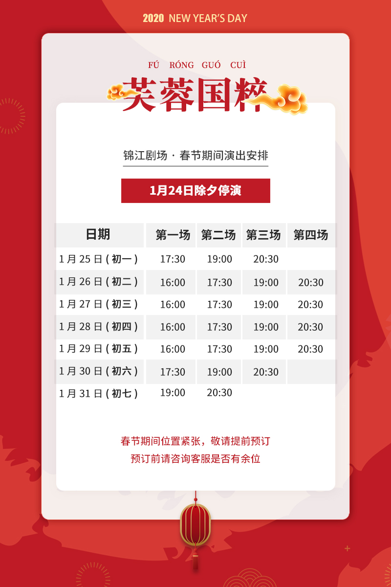 3. 芙蓉国粹演出时间:每晚20:00-21:30演出,旅游黄金季节有可能加演,详询客服;