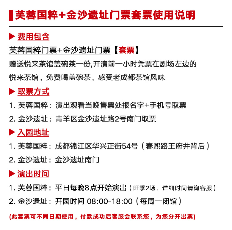 b. 乙票套票:金沙遗址门票+芙蓉国粹乙票(1楼2边和2楼1-7排中间区域),赠送悦来茶馆盖碗茶;