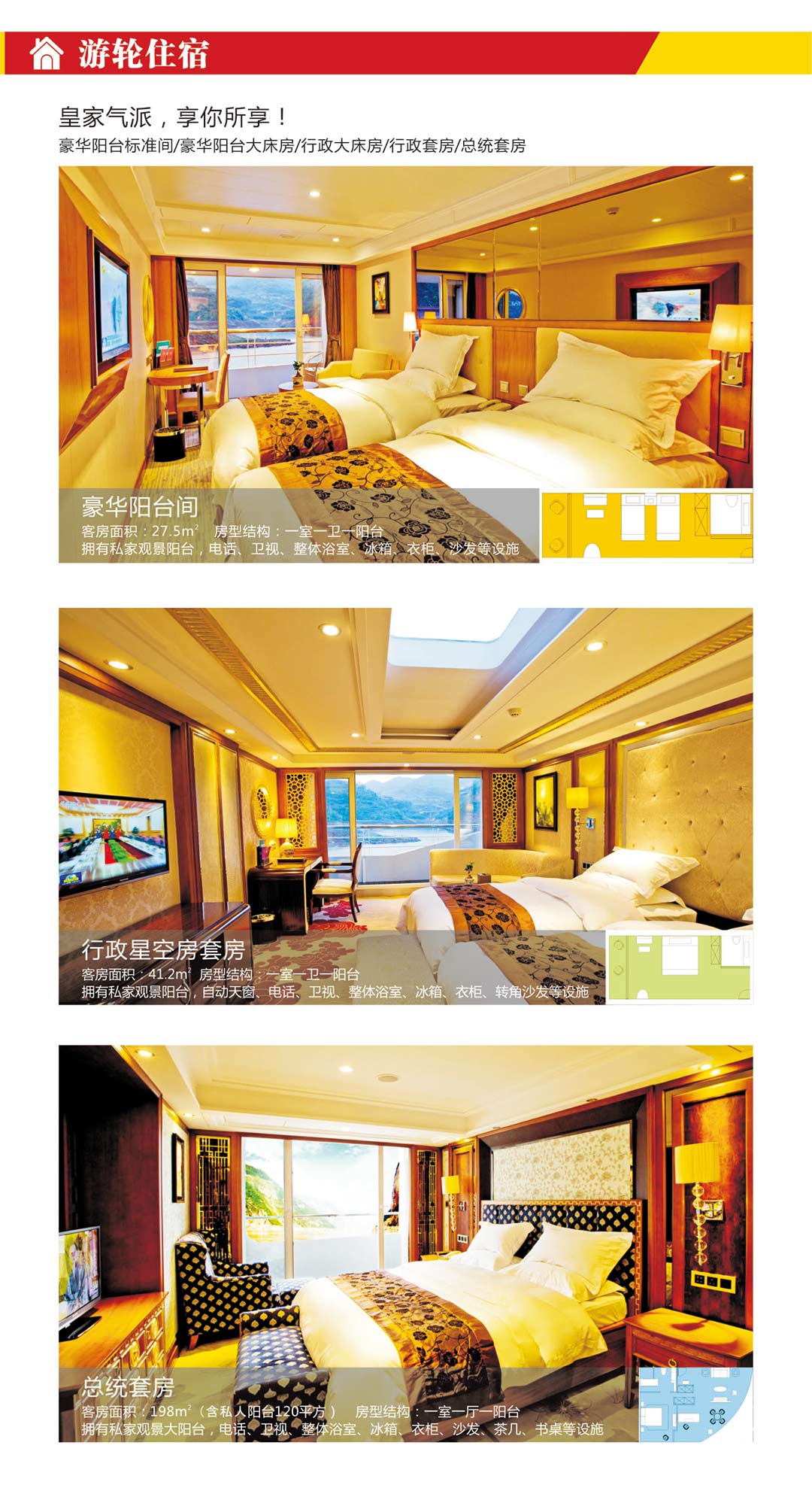 2、五星级豪华客房住宿。宜昌至重庆(上水)行程含游轮上4晚住宿,重庆至宜昌(下水)行程含游轮上3晚住宿。客房均有私人观景阳台、五星级标准的客房用品。