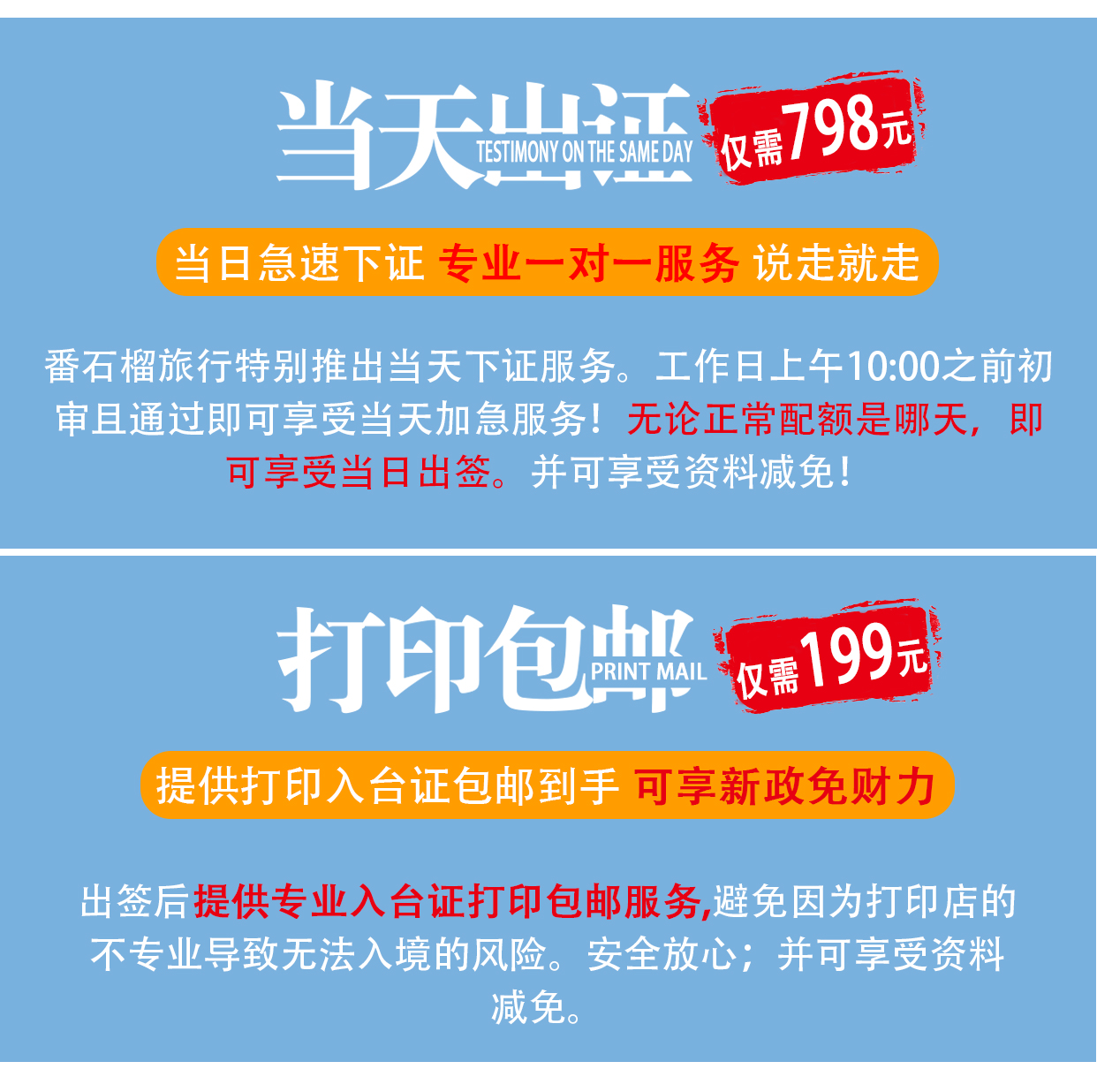 21. 页面标注工作日出签:为配额日后3个工作日出签(如出现退补件问题,下证日期可能会被顺延1-2个工作日)。所规定出签时间为工作日时间,不包含非工作日/节假日/移民署休息时间。如因非工作时间造成延误,我方不承担旅客损失,台湾移民署非工作日时间是不上班的。如遇节假日另行通知。入台证上标注出签日期为移民署随机标注,请知晓。