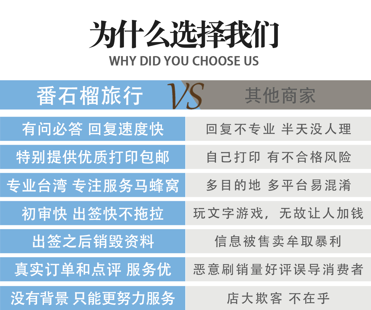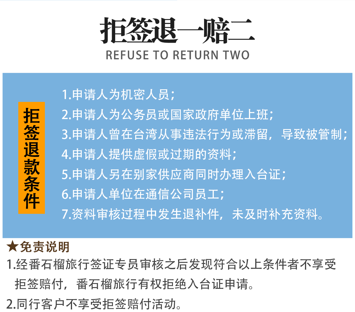 16. 出现【以下原因】并不保证准时下证或导致入台证不能下证等问题, 我方不承担任何责任。且费用不退。故申请入台证必须按实申报我社。