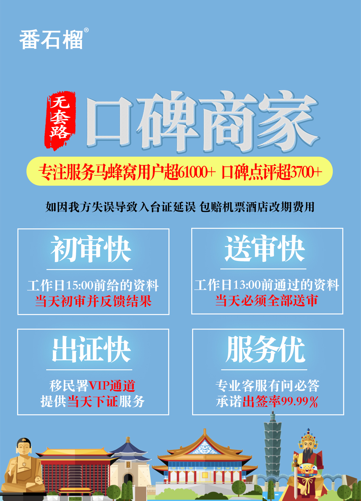 22. 移民署每天审件任务繁重,下发的入台证信息请客人仔细核对。一旦发现有误,请您尽快联系番石榴旅行售后处理,以免耽误您的行程;修改时间将会根据移民署实际情况而定(一般为2个小时-3个工作日不等);