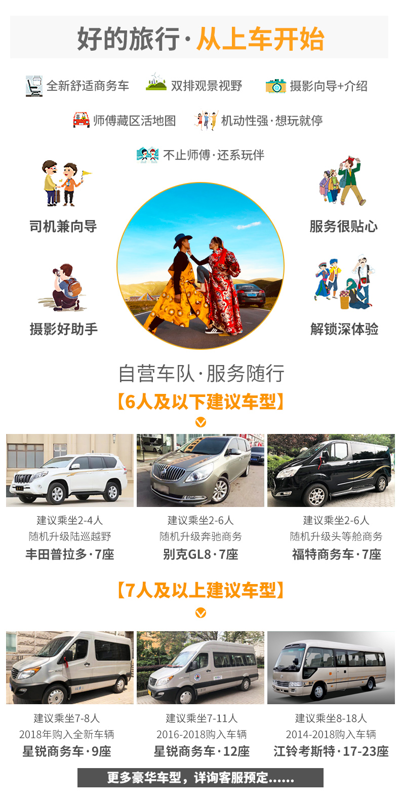 2. 包车:全程专属用车及专属司机服务(根据人数匹配车型;含油费、过路费、导游各项差旅补助等~每日正常工作时间不超过8小时);