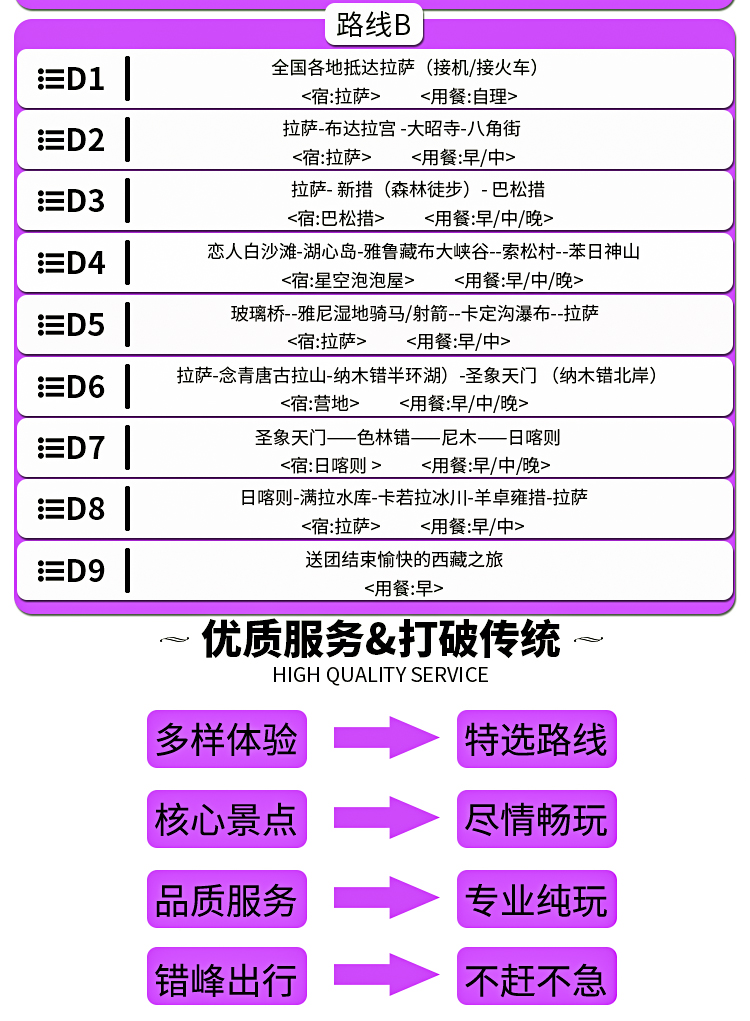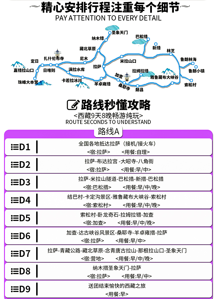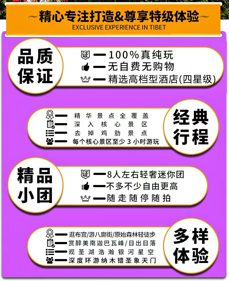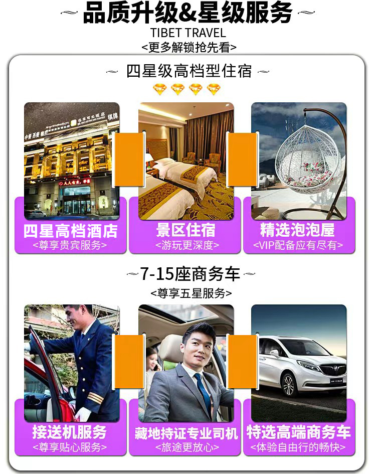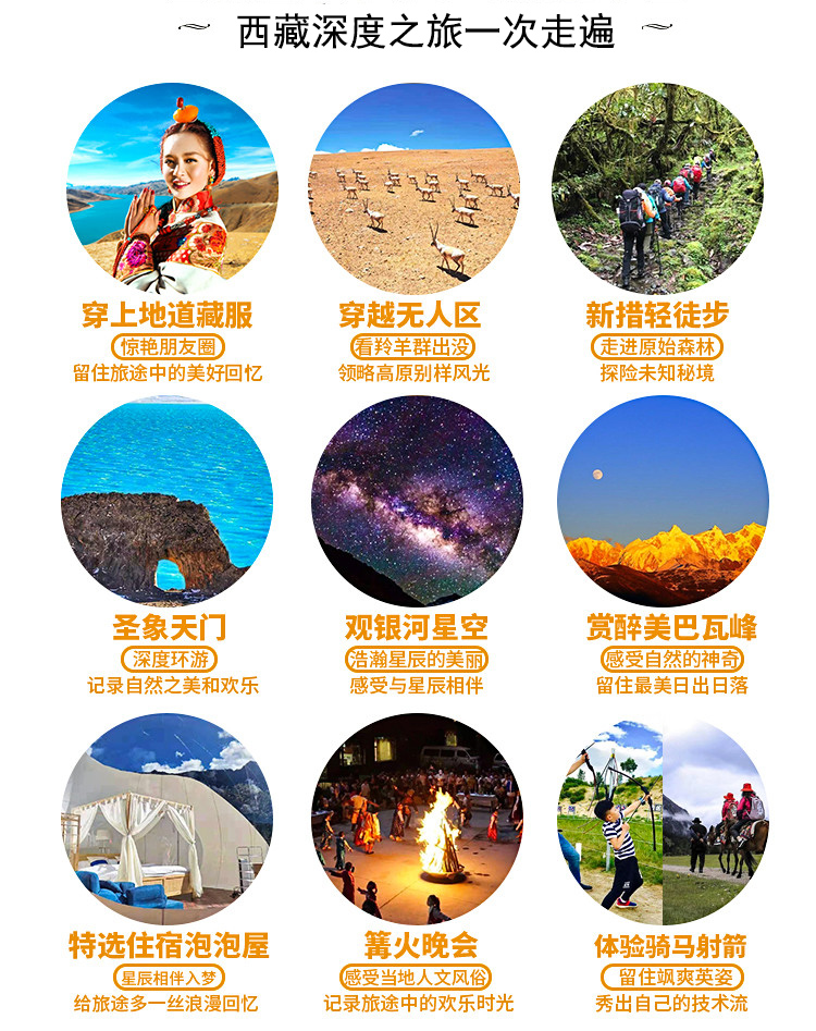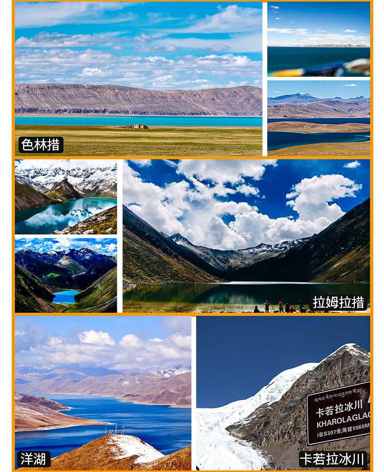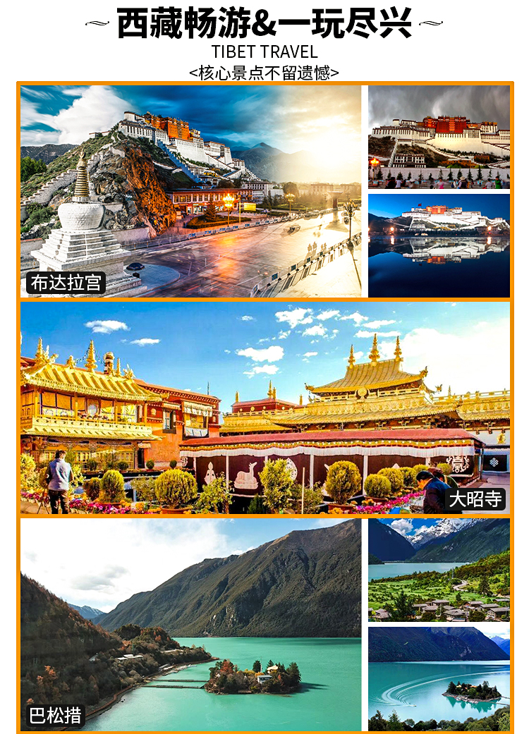 4. 门票:线路包含的所有描叙景点们;(布达拉宫,大昭寺,巴松措,新措,卡定沟瀑布,雅鲁藏布大峡谷,扎什伦布寺,羊湖,卡若拉冰川,纳木错圣象天门,景点门票含景区环保车)