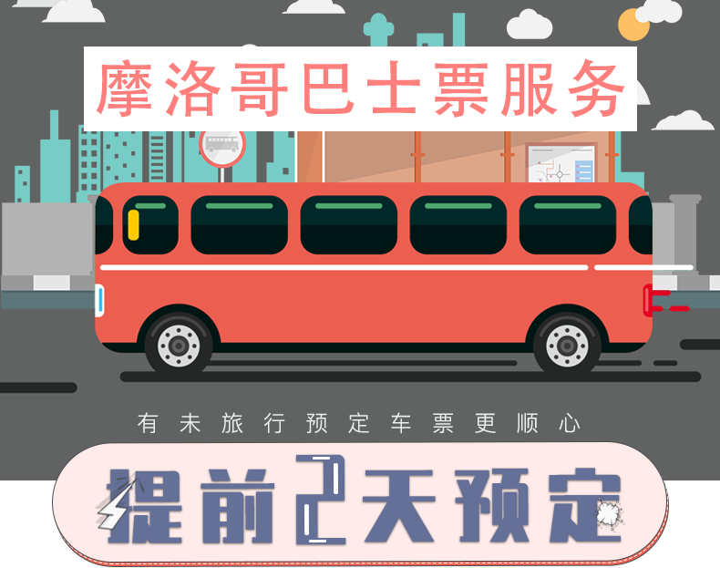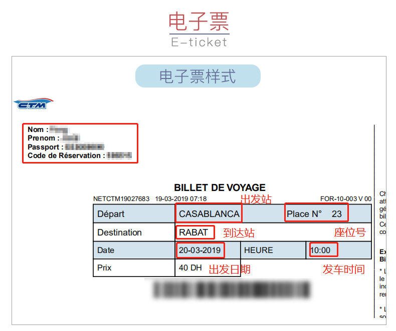 限票面指定时间,从卡萨布兰卡CTM大巴站出发,至马拉喀什CTM大巴站。