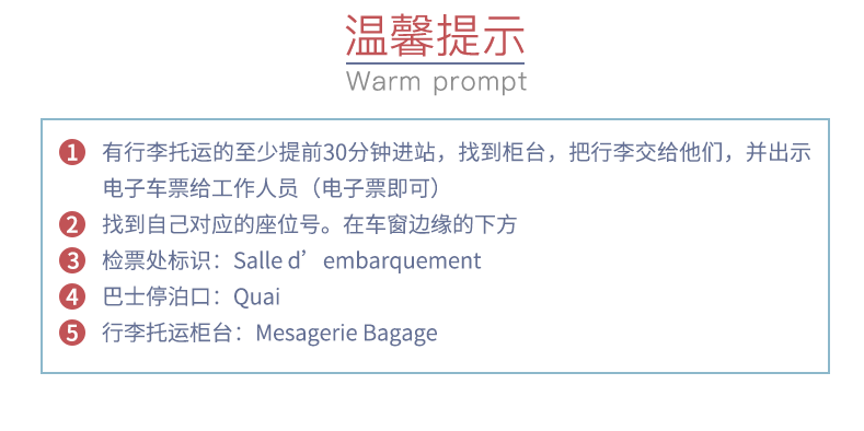行李托运:有行李托运的至少提前30分钟进站,找到Mesagerie Bagage柜台,把行李交给他们,并出示电子车票给工作人员