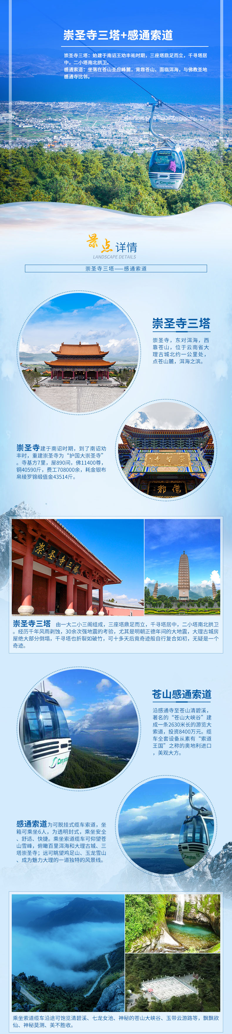 苍山The CangShan Mountain·苍山风光秀美,主峰的积雪风光巍峨壮观,是大理著名的“风花雪月”四景之一。 ·山腰间修有一条长约18公里的游山步道,称为玉带云游路,可俯瞰大理坝子和洱海风光。 ·上苍山有乘坐索道和步行走登山步道两个途径,分别可达山腰玉带路上的清碧溪、中和寺和洗马潭。 ·...
