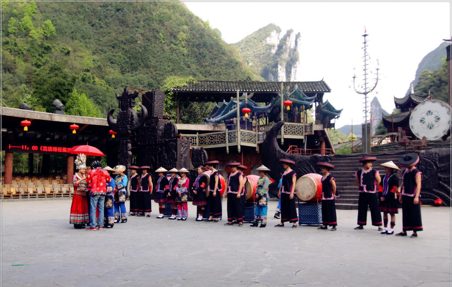 德夯苗寨“德夯”为苗语,意为美丽的峡谷,苗鼓舞是德夯苗寨的最大特色。