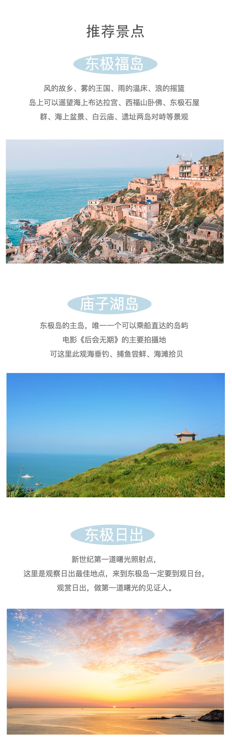 5. 如有指定时间下单时请备注船票时间,若不备注我们将根据船票余票随机出票,默认出票时间:朱家尖-东极岛 06:50-16:00 东极岛-朱家尖08:30- 15:30(根据余票安排,不一定是此时间)